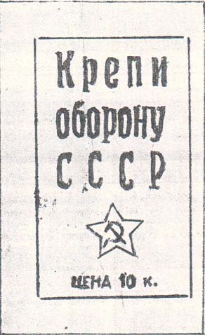 1932 1932 г. Разм. 50 х 80 мм. 0дноцветная печать на желто-ватой рыхлой бумаге. В прямоугольной рамке разм. 32 х 62 мм в центре текст в три строки: «Крепи оборону СССР». Ниже пятиконечная звезда с серпом и молотом в центре. Внизу номинал: «Цена 10 к.».