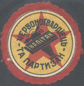 1932 1932(?) г. Составной знак. Круг диаметром 38 мм на под-ложке из красной материи. Двухцветная печать на белой бумаге. В двойной круглой рамке силуэт самолета на фоне красной звезды. Текст на украинском языке: «На самолет Красногвардеец и Партизан».