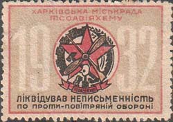 1932 1932 г. Разм. рамки 38 х 26 мм. Многоцветная печать на белой бумаге. Зубц. 12. В центре в прямо-угольной рамке эмблема ОСОАВИАХИМ. Сверху текст в две строки на украинском языке: «Харьковский горсовет ОСОАВИАХИМа». Внизу текст в две строки на украинском языке: «Ликвидируем неграмотность по противовоздушной обороне».