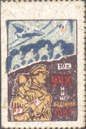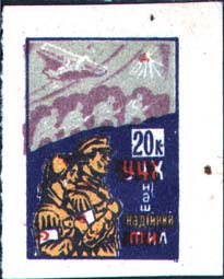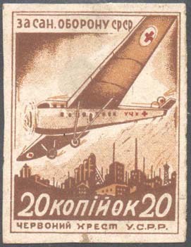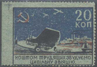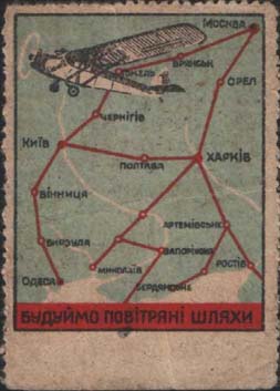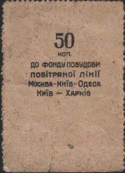 1927 1927 г. Разм. рамки 38 х 48 мм. Трехцветная двух-сторонняя печать на сероватой бумаге. Нерегулярная зубц. На лицевой в прямоугольной рамке стороне схема авиалиний. Сверху пассажирский самолет-моноплан, летящий влево. Внизу текст на украинском языке: «Строим воздушные пути». На оборотной стороне сверху номинал и текст в четыре строки: «В фонд создания воздушной линии Москва-Киев-Одесса-Киев-Харьков».