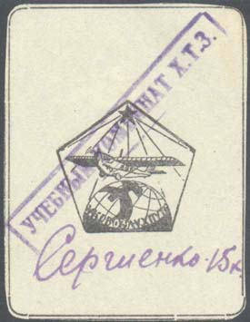 1927 1927(?) г. Разм. рамки 43 х 57 мм. Одноцветная печать на белой бумаге. В прямоугольной рамке с за-кругленными краями в центре в пятиугольнике самолет над земным шаром. На земном шаре текст: «Укрквоздухпуть». По диагонали фиолетовый оттиск контрольного штампа с текстом: «Учебный комбинат Х.Т.З.».