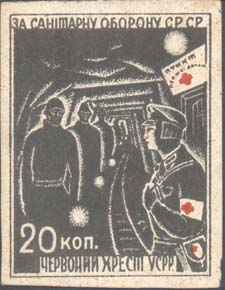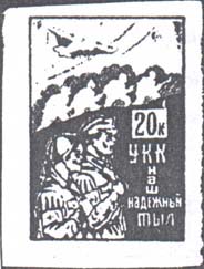 1932 1932 г. Разм. рамки 23 х 32 мм. Многоцветная печать на белой (оттенки) бумаге. В центре слева на темном фоне юноша и девушка с повязками с красным крестом на рукавах. Справа номинал и текст в три строки. Сверху на холме цепь красноармейцев с винтовками наперевес. Сверху в небе на силуэт самолета и разрыв шрапнели.