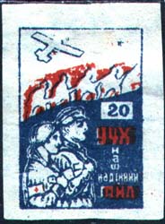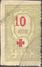 1932 1932(?) г. Разм. рамки 20 х 25,5 мм. Двухцветная печать на тонкой сероватой бумаге. Нерегулярная зубц. В центре в рамке сложной формы номинал. Ниже в круглой рамке красный крест. Внизу в аббревиатура на украинском языке: «У.К.К.».