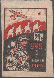 1931 1931 г. Разм. по перфорации 50 х 68 мм. Одноцветная печать на бумаге различных цветов и качества. Нерегулярная зубц. В прямоугольной рамке разм. 38,5 х 50 мм в центре эмблема ОСОАВИАХИМ. Сверху полукругом текст на украинском языке: «Крепи оборону СССР». Под эмблемой текст полукругом в четыре строки на украинском языке: «На массовую военизацию трудящихся дор[ожного]. совета ОСОАВИАХИМа Ю.В.ж.д.». В нижних углах рамки номинал.