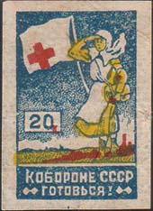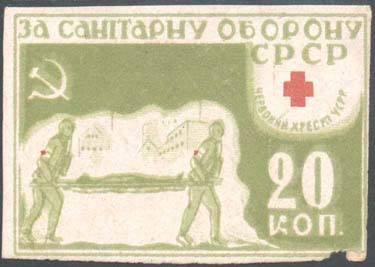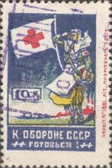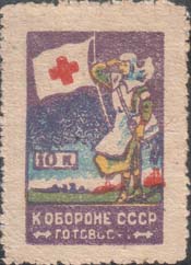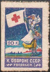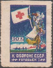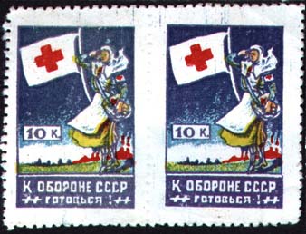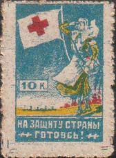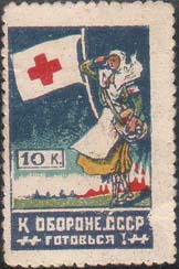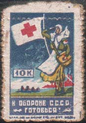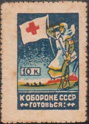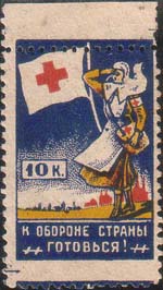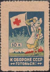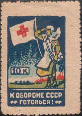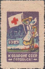 1932 1932(?) г. Многоцветная печать низкого качества на бумаге различных видов. С клеем и без клея. Нере-гулярная зубц и БЗ. Санитарка и флаг с красным крестом. Внизу текст в две строки: «К обороне СССР готовься!».