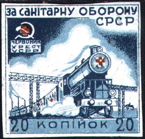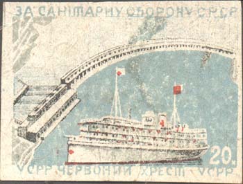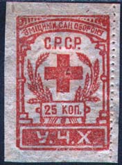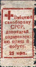 1932 1932 г. Разм. 22 х 43 мм. Одноцветная печать на сероватой рыхлой бумаге низкого качества. Нерегулярная зубц. В прямоугольной рамке разм. 20,5 х 41 мм слева сверху красный крест. В центре текст в семь строк на украинском языке: «Крепи санитарную оборону СССР, помогай оздоровлению труда и быта». Ниже номинал.