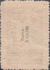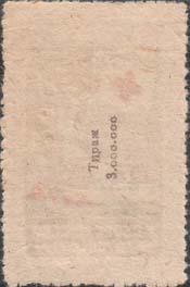 1932 1932(?) г. Разм. рис. 22 х 33,5 мм. Двухсторонняя печать на желтоватой бумаге. Рисунок лицевой стороны аналогичен предыдущему выпуску. На оборотной стороне вертикально снизу вверх текст в две строки: «Тираж 3,000.000».