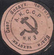 1924 1924 г. Круг диаметром 35 мм. Одноцветная печать на розовой бумаге. На лицевой стороне в тройной круглой рамке диаметром 35 мм серп и молот. Сверху аббревиатура «А,К.С.С.Р.». Внизу аббревиатура «НКЗ». По периметру между рамками текст: «Враги чахотки: Свет, Воздух, чистота».