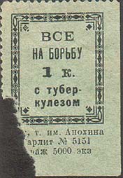 1929 1929 г. Разм. 28 х 45 мм. Одноцветная печать на бумаге различных цветов. Зубц. 14 1/2. В двойной прямоугольной декоративной рамке в центре номинал. Сверху текст в две строки: «Все на борьбу». Внизу продолжение текста: «С туберкулезом».