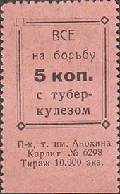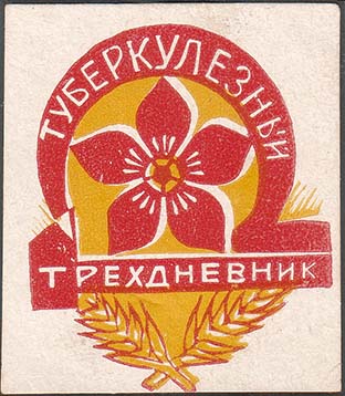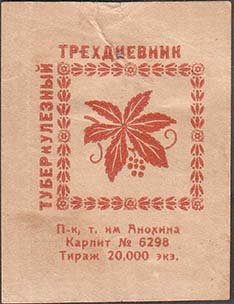 1930 1930(?) г. Разм. рамки 24 х 24 мм. Одноцветная печать на светло-желтой бумаге. В центре ветка бузины(?). По периметру рамки текст: «Туберкулезный трехдневник». Внизу под рамкой мелким шрифтом выходные данные: «П-к, т. им. Анохина Карлит №6298 Тираж 20.000 экз.».