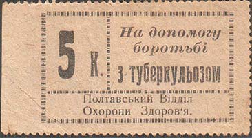 1924 1924 г. 1924 г. Разм. по перфорации 56 х 33 мм. Одно-цветная печать на плотной светло-бежевой бумаге. Зубц. 11 1/2(?). С клеем. В декоративной прямоугольной рамке разм. 46,5 х 27 мм слева номинал. Справа текст в три строки на украинском языке: «На помощь борьбе с туберкулезом». Внизу текст в две строки на украинском языке: «Полтавский Отдел Охраны Здоровья».
