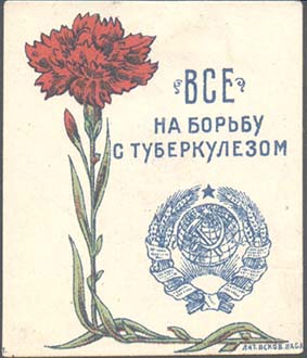 1924 1924 г. 23.-24.04.1924 г. Разм. 46 х 57 мм. Трехцветная печать на белой бумаге. Слева цветок гвоздики с загнутым горизонтально стеблем. Справа в верхнем углу текст в три строки: «Все на борьбу с туберкулезом». Справа внизу герб СССР с шестью лентами. В правом нижнем углу мелким шрифтом выходные данные: «Лит. Псков. Набат».