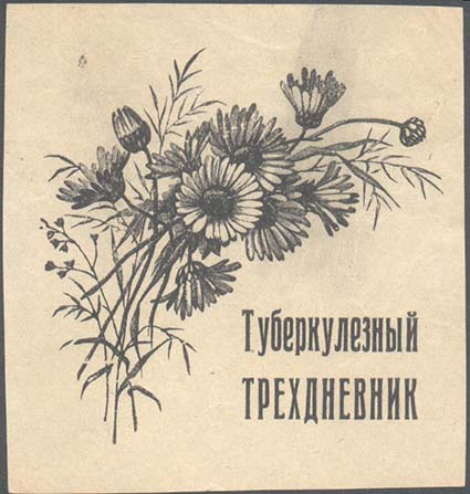 1925 1925(?) г. Разм. 75 х 80 мм. Одноцветная печать на кремовой бумаге. Слева букет из цветов ромашки. Справа внизу текст: «Туберкулезный трехдневник».