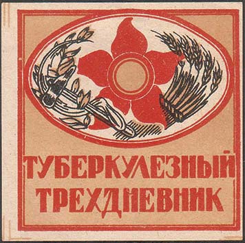 1926 1926 г. Разм. 54 х 66 мм. Двухцветная печать на белой бумаге. В центре в стилизованной рамке из серпа и молота стилизованный цветок мака. Внизу два скрещенных колоса ржи. На серпе и молоте текст: «Туберкулезный трехдневник».