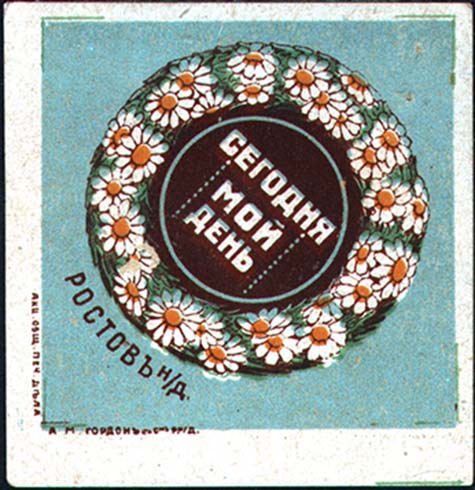 1915 1915(?) г. Ромб разм. 82 х 82 мм. Многоцветная печать на желтоватой бумаге с мелованным верхним слоем. В рамке в виде ромба разм. 71 х 71 мм в центре круглый венок из ромашек. Внутри венка в круглой рамке диаметром 24 мм текст в три строки: «Сегодня мой день». Внизу полукругом текст: «Ростов н/Д». Внизу по периметру рамки мелким шрифтом выходные данные: «Акц. Общ. Печ. Дела А.М.Гордон с С-м Р. н/Д.».