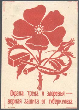 1926 1926 г. Сентябрь. Разм. 42 х 60 мм. Одноцветная печать на белой бумаге различных оттенков. В центре цветок мака с листьями и двумя бутонами и серп и молот. Внизу текст в две строки: «Охрана труда и здоровья – верная защита от туберкулеза». По углам разграничительные линии.