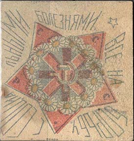 1925 1925(?) г. Ромб разм. 67 х 67 мм. Трехцветная печать на толстой светло-желтой рыхлой бумаге. В центре пятиконечная звезда с буквами аббревиатуры «СССР» на лучах. В центре звезды в венке из ромашек серп и молот и красный крест. По наружному периметру звезды текст: «Все на борьбу с социальными болезнями». Справа вертикально выходные данные мелким шрифтом неразборчиво.