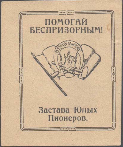1923 1923(?) г. Разм. 69 х 82 мм. Одноцветная печать на желто-серой бумаге. В центре в тройной прямоугольной рамке с закругленными краями пионерский значок. Сверху текст в две строки: «Помогай беспризорным!». Внизу текст в две строки: «За-става Юных Пионеров».