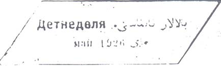 1926 1926 г. Виньетка в форме параллелограмма разм. 61 х 21 мм. Одноцветная печать на красно-карминовой полуглянцевой бумаге. Слева текст в две строки: «Детнеделя 1926». Справа текст на татарском языке арабским шрифтом в две строки.