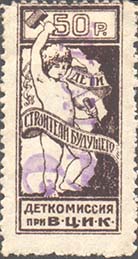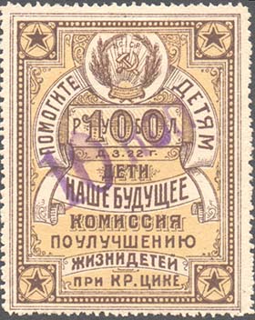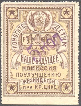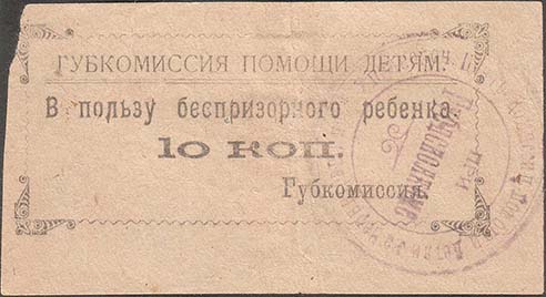 1930 1930(?) г. Разм. 83 х 44 мм. Одноцветная печать на тонкой сероватой бумаге. В центре в декоративной пря-моугольной рамке с орнаментом по углам сверху текст с подчеркиванием: «Губкомиссия помощи детям. В пользу беспризорного ребенка». Ниже номинал. Справа внизу текст: «Губкомиссия». Справа на лицевой стороне фиолетовый оттиск круглой печати Губкомиссии.