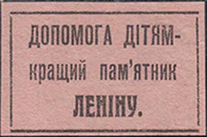 1930 1930(?) г. Разм. 49 х 32 мм. Одноцветная печать на тонкой розовой бумаге. В прямоугольной рамке разм. 45 х 28,5 мм текст на украинском языке в три строки: «Помощь детям – лучший памятник Ленину».