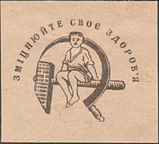 1928 1928 г. Разм. 54 х 48 мм. Одноцветная печать на тонкой желто-серой бумаге. В центре серп и молот, на рукоятке которого сидит мальчик. Сверху полукругом текст на украинском языке: «Укрепляйте свое здоровье».