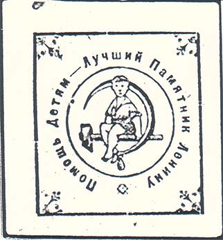 1923 г. Разм. 45 х 54 мм. Одноцветная печать на желтоватой бумаге. В декоративной рамке с растительным орнаментом разм. 31 х 45 мм сверху текст в четыре строки: «На помощь больному и беспризорному ребенку Армотдела». Внизу номинал и орнамент из ромбиков.