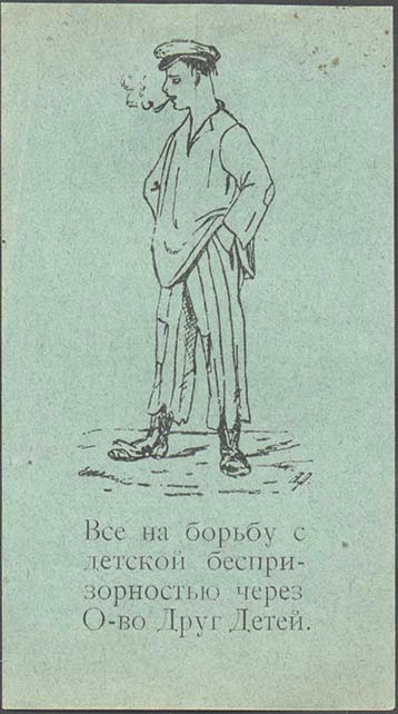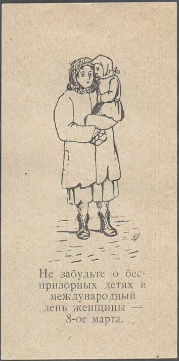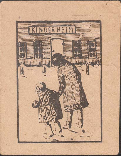 1926 1926(?) г. Разм. 70 х 88 мм. Одноцветная печать на желтоватой бумаге. В прямоугольной рамке разм. 49 х 69 мм двое беспризорных детей и здание в вывеской на немецком языке.
