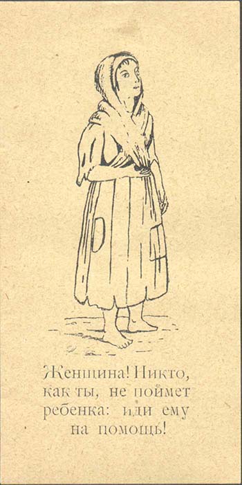 1915 1915(?) г. Разм. 55 х 28 мм. Одноцветная печать на бумаге различных цветов. В центре текст в четыре строки: «Все возрастающее количество детей совершенно не обеспечено, нужна скорая помощь».
