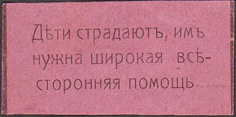 1915 1915(?) г. Разм. 55 х 28 мм. Одноцветная печать на розовой бумаге. В центре текст в три строки: «Дети страдают, им нужна широкая всесторонняя помощь».