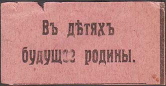 1915 1915(?) г. Разм. 55 х 28 мм. Одноцветная печать на бумаге различных цветов. Текст в две строки: «В детях будущее Родины».