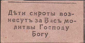 1915 1915(?) г. Разм. 55 х 28 мм. Одноцветная печать на бумаге различных цветов. В центре текст в четыре строки: «Дети сироты вознесут за Вас молитвы Господу Богу».