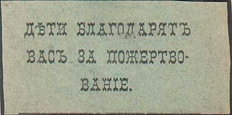 1915 1915(?) г. Разм. 55 х 28 мм. Одноцветная печать на бумаге различных цветов. В центре текст в три строки: «Дети благодарят вас за пожертвование».