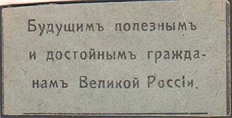 1915 1915(?) г. Разм. 55 х 28 мм. Одноцветная печать на бумаге различных цветов. В центре текст в три строки: «Будущим полезным и достойным гражданам Великой России».