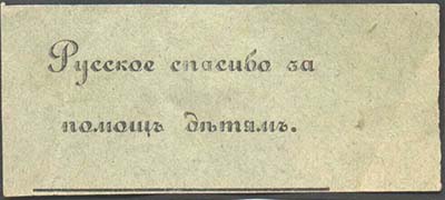 1915 1915(?) г. Разм. 55 х 28 мм. Одноцветная печать на бумаге различных цветов. В центре текст в две строки: «Русское спасибо за помощь детям».