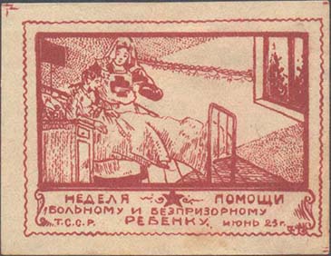 1923 1923 г. Июнь. Разм. 60 х 46 мм. Одноцветная печать на желтоватой бумаге. В центре в прямоугольной рамке имитирующей зубцовку разм. 55 х 40 мм ребенок, сидящий на постели в больничной палате и медсестра. Внизу текст в три строки: «Неделя помощи больному и беспризорному ребенку. ТССР. Июнь 1923 г.».