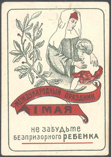 1926 1926 г. 01.05.1926 г. Разм. 61 х 86 мм. Двухцветная печать на белой бумаге. В прямоугольной рамке с закругленными краями разм. 55 х 79 мм женщина обнимает ребенка. Слева оливковая ветвь. Ниже на ленте текст: «Международный праздник 1 Мая». Внизу текст в две строки: «Не забудьте беспризорного ребенка».