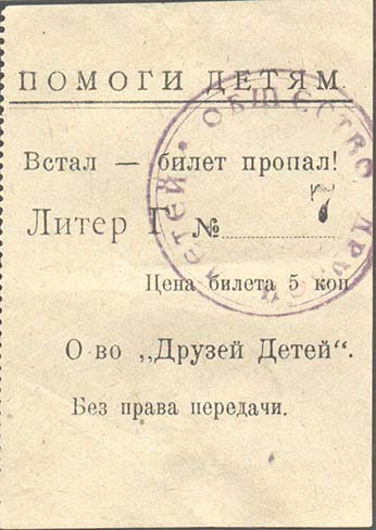 1924 1924(?) г. Листок из квитанционной книжки разм. 59 х 82 мм. Одноцветная печать на тонкой белой бумаге. Левосторонняя зубц. 11 1/2. Сверху текст с подчеркиванием: «Помоги детям». В центре текст в пять строк: «Встал – билет пропал! Литер Г №... Цена билета 5 коп. О-во «Друзей детей». Без права передачи». На лицевой стороне фиолетовый оттиск круглой печати общества.