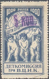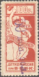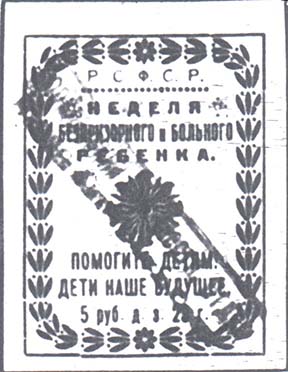 1923 1923 г. 12.04.1923 г. Разм. 50 х 64 мм. Одноцветная печать на серо-желтой бумаге. В центре в прямоугольной рамке разм. 41 х 55 мм декоративный элемент в виде цветка. Сверху текст в четыре строки: «Р.С.Ф.С.Р. неделя беспризорного и больного ребенка». Внизу текст в две строки: «Помогите детям. Дети наше будущее». Внизу номинал: «5 руб. Д.З. 23 г.». На лицевой стороне фиолетовый оттиск прямоугольной печати с неразборчивым текстом.