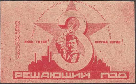 1931 1931(?) г. Разм. 80 х 50 мм. Одноцветная печать на белой бумаге. На сплошном фоне в центре индустриальный пейзаж, пятиконечная звезда, цифра «3» и пионер, отдающий салют. Сверху полукругом текст: «Пролетарии всех стран соединяйтесь». Слева текст: «Будь готов!». Справа продолжение текста: «Всегда готов!». Слева вертикально текст в две строки: «Издание Всерообпома». Внизу текст: «Решающий год».