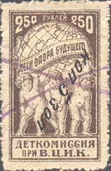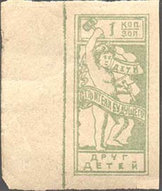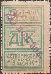 1924 1924(?) г. Разм. рамки 17,5 х 38 мм. Одноцветная печать на желтоватой бумаге. С клеем. Рис. аналогичен рисунку марок всесоюзного выпуска Деткомиссии при ВЦИК. Внизу текст в две строки: «Друг детей».