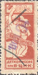 1924 1924 г. Фиолетовые вертикальные надпечатки нового номинала в виде текста на марке первого всероссийского выпуска номиналом 100 руб. Тип I.