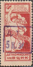 1924 1924 г. Фиолетовая горизонтальная надпечатка нового номинала в виде текста в две строки в прямо-угольной рамке: «Д.Т.К. 5 коп. зол.» на марке первого всероссийского выпуска номиналом 100 р. Тип. I.