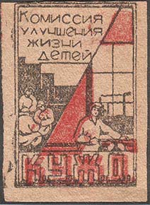 1924 1924(?) г. Разм. рамки 29 х 44 мм. Двухцветная печать на сероватой бумаге. В двойной прямоугольной рамке слева сверху беспризорники на улице. Справа внизу подросток за станком. В левом верхнем углу текст в четыре строки: «Комиссия улучшения жизни детей». Внизу крупными буквами аббревиатура «К.У.Ж.Д.».