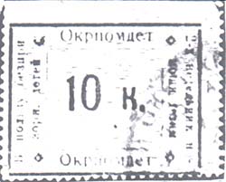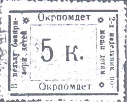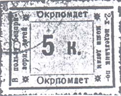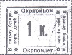 1924 1924(?) г. Разм. рамки 36 х 28 мм. Одноцветная печать на бумаге различных цветов. Зубц. 14 1/2. В центре в дополнительной прямоугольной рамке номинал. По периметру между рамками текст: «Окркомпом. В пользу больн[ых]. и ран[еных]. Кр[асноармей]-цев. Окрпомдет. В пользу беспризорн[ых]. детей». По углам между рамками декоративные элементы. На лицевой стороне фиолетовые фрагменты оттиска круглой контроль-ной печати.