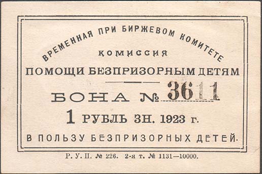 1923 1923 г. Разм. 86 х 53 мм. Одноцветная печать на толстой белой бумаге. В центре в двойной прямоугольной рамке разм. 76 х 45 мм текст: «Бона №...». Сверху текст в три строки: «Временная при биржевом комитете комиссия помощи беспризорным детям». Ниже номинал: «... зн. 1923 г.». Внизу текст: «В пользу беспризорных детей». Внизу под рамкой мелким шрифтом выходные данные: «Р.У.П. №226 2-я т. №1131 - 10000».