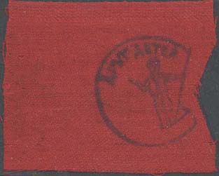 1924 1924(?) г. Разм. 52 х 41 мм. Одноцветная печать красной материи. Справа вырез в виде фестона. В рамке сложной формы рисунок ребенка с флагом, на котором текст: «Друг детей».