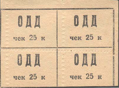 1924 1924(?) г. Разм. рамки 33 х 23 мм. Одноцветная печать на желтоватой бумаге. Нерегулярная зубцовка низкого качества. В прямоугольной рамке текст в две строки: «ОДД Чек ... к».