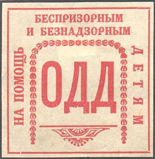 1924 1924 г. Разм. 52 х 54 мм. Одноцветная печать на тонкой белой бумаге. В центре в прямоугольной рамке разм. 49 х 50 мм аббревиатура «ОДД» в обрамлении рамки из декоративных элементов. По периметру рамки текст: «На помощь беспризорным и безнадзорным детям».
