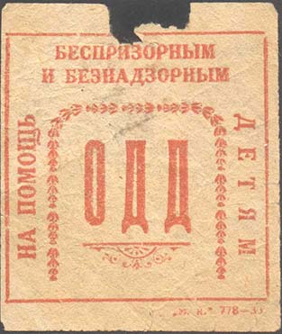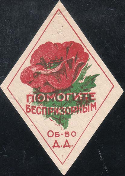 1930 1930(?) г. Ромб разм. 70 х 97 мм. Двухцветная печать на тонкой белой бумаге. В рамке в форме ромба разм. 60 х 87 мм в центре цветок мака и текст в две строки: «Помогите беспризорным». Внизу текст в две строки: «Об-во Д.Д.».